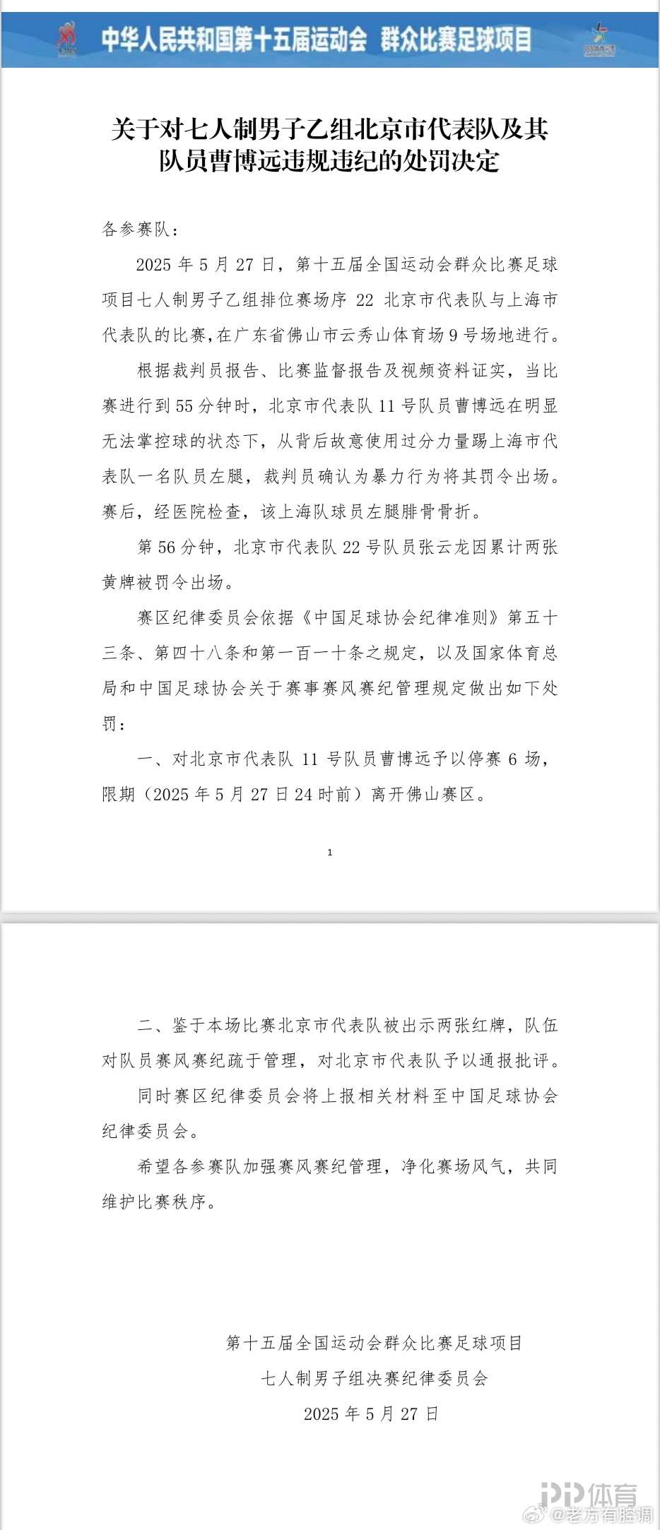一、對北京市代表隊11號隊員曹博遠(yuǎn)予以停賽6場,限期(2025年5月27日24時前)離開佛山賽區(qū)。