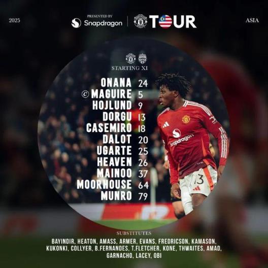 曼聯(lián)首發(fā):奧納納,馬奎爾(C),霍伊倫,多爾古,卡塞米羅,達(dá)洛特,烏加特,海文,梅努,摩爾豪斯,蒙羅;