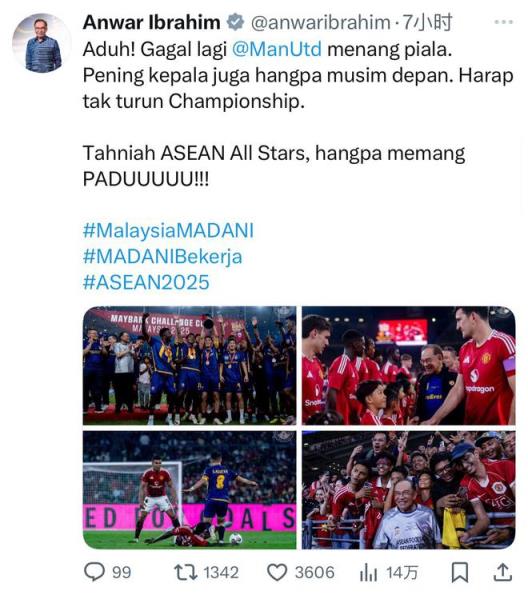 雷速體育5月29日訊 在曼聯(lián)0-1輸給東南亞全明星隊后,馬來西亞總理安瓦爾更新社媒,調(diào)侃了曼聯(lián)的表現(xiàn)。