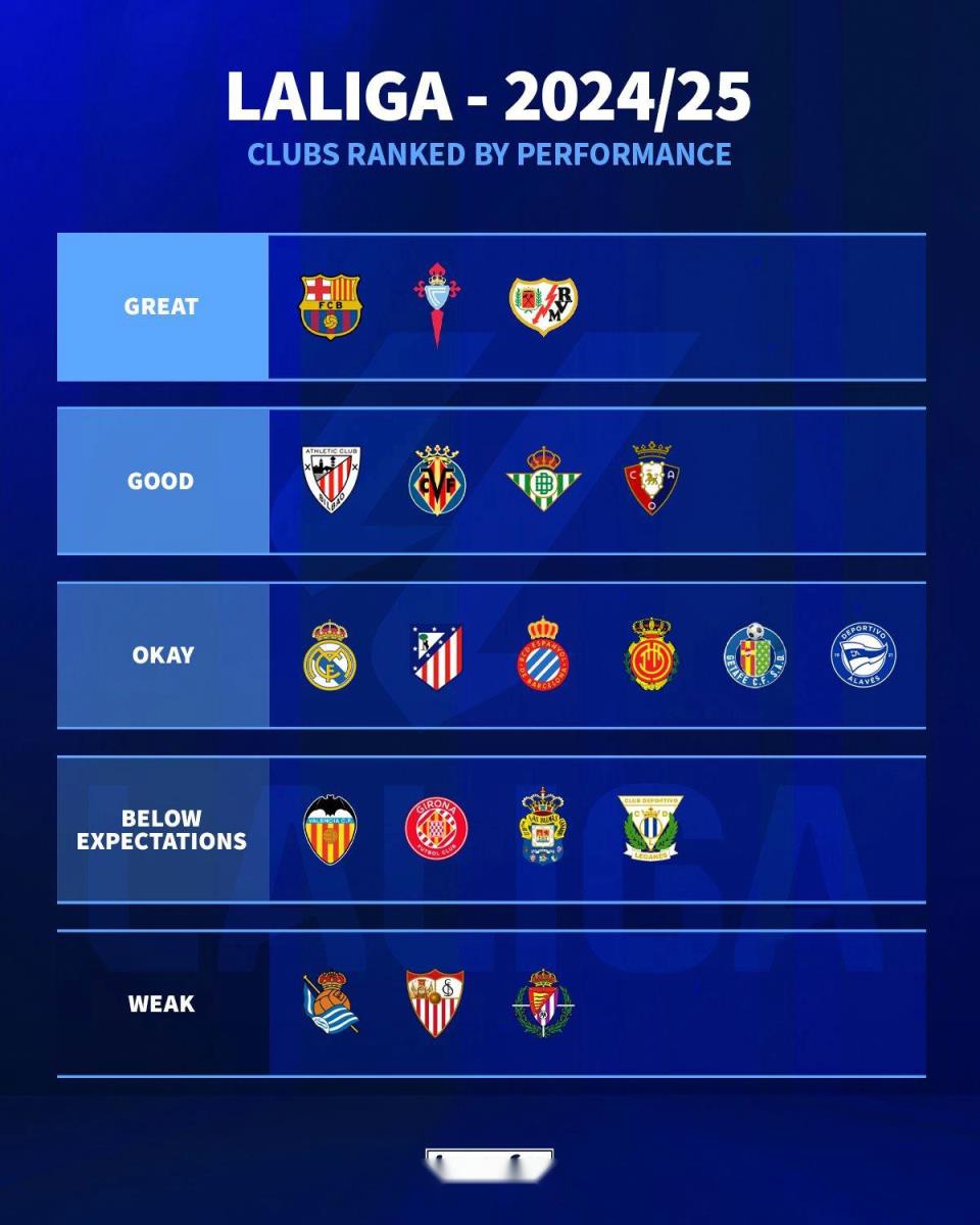 北京時(shí)間5月29日,德轉(zhuǎn)官方評(píng)價(jià)西甲各隊(duì)本賽季表現(xiàn),其中巴薩、塞爾塔、巴列卡諾表現(xiàn)最好,皇馬、馬競(jìng)被評(píng)為及格。