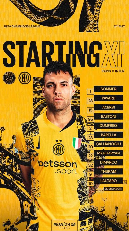 國米2025年歐冠決賽首發(fā):索默/迪馬爾科、巴斯托尼、阿切爾比、帕瓦爾、鄧弗里斯/恰爾汗奧盧、姆希塔良、巴雷拉/勞塔羅、小圖拉姆