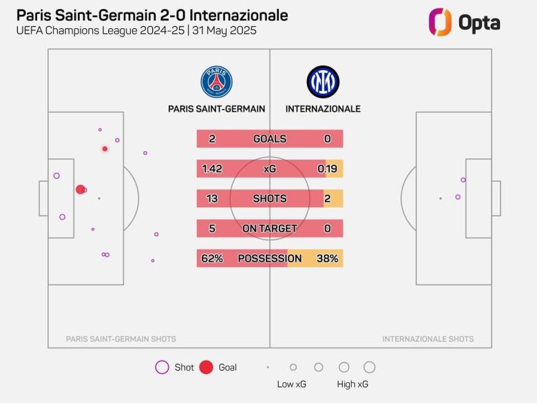 而巴黎圣日耳曼歐冠決賽上半場(chǎng)5次射正則與2013年的多特蒙德和2022年的利物浦并列最多。