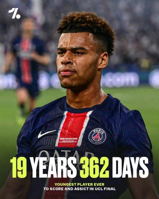 直播吧06月01日訊 歐冠決賽巴黎5-0戰(zhàn)勝國米,19歲零362天的杜埃2射1傳。