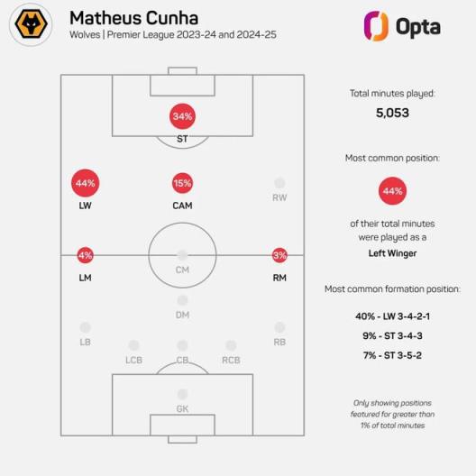 庫尼亞在狼隊的92場比賽打入了33球,他在俱樂部生涯中270場打進了72球。魯本·阿莫林將希望他解決球隊的進球難問題,巴西前鋒預計將擔任343陣型中的左側10號位。在狼隊,兩任主帥加里·奧尼爾和維克多·佩雷拉手下都主要使用三后衛(wèi)體系,庫尼亞可以踢左路和中路,較少打右側。