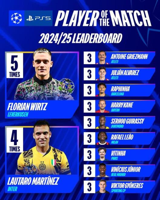 2024-25賽季歐冠落幕,歐冠官方統(tǒng)計了本賽季歐冠全場最佳球員次數(shù),維爾茨以5次居首,勞塔羅-馬丁內(nèi)斯以4次排名第二。
