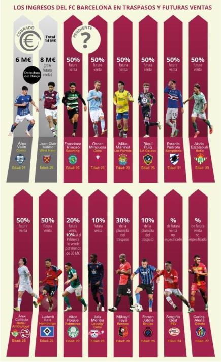 根據俱樂部消息人士透露,巴薩重返1:1規(guī)則不僅將依靠托迪博和巴列帶來的收入,還將依靠其他前球員如特林康(葡萄牙體育)、明格薩(塞爾塔)或馬莫爾(拉斯帕爾馬斯)的可能轉會,再加上主教練弗里克棄用的球員如佩尼亞或托雷(后者將續(xù)約以便被出售)。結合這些操作,再加上朗格萊離隊加盟馬德里競技為巴薩節(jié)省的2000萬歐元薪資,以及等待敲定安蘇租借至摩納哥的事宜,巴薩將確保能夠注冊霍安-加西亞。