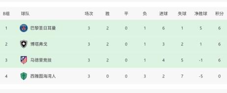 馬競在賽前除了希望贏球之外, 還得力爭大勝對手3球才行,畢竟末輪同組的大巴黎贏球的可能性很大,極有可能出現(xiàn)大巴黎、馬競和博塔弗戈積分相同,相互戰(zhàn)績也相同,這樣比較凈勝球的話,第三輪之前馬競是吃虧的。無奈的是一直到下半場的第87分,馬競才取得進(jìn)球,一場1比0的勝利,不足以讓馬競實(shí)現(xiàn)逆襲,最終排名小組第三,無緣淘汰賽。