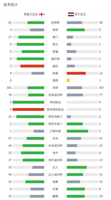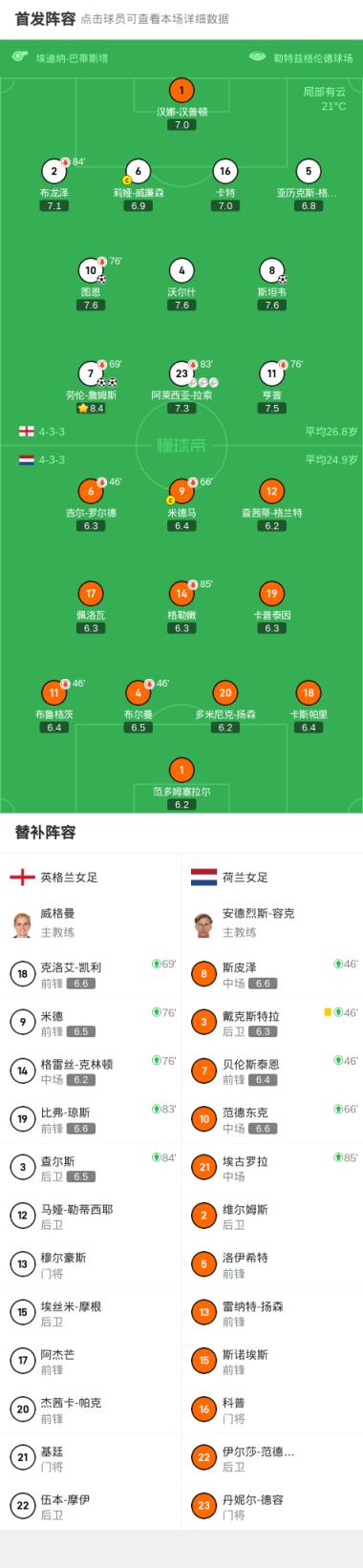 女足歐洲杯小組賽第2輪,英格蘭女足以4-0完勝荷蘭女足。切爾西球員勞倫-詹姆斯上演梅開二度,阿森納前鋒阿萊西亞-拉索貢獻(xiàn)3次助攻,斯坦韋與圖恩各取得1粒進(jìn)球。最終,英格蘭女足4-0大勝荷蘭女足,前兩戰(zhàn)1勝1負(fù),荷蘭女足戰(zhàn)績(jī)同為1勝1負(fù)。